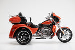 The Harley-Davidson CVO™ Tri Glide® is a super-premium, factory custom trike designed for ultimate touring, featuring powerful Milwaukee-Eight® 117 engine, high-end Boom! Box™ GTS infotainment, and unique, luxury finishes. It boasts premium paint, Tomahawk™ wheels, comfortable seating, extensive storage, and advanced rider-assist features for a unique and comfortable three-wheeled experience.