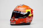 The mini helmet of Sergio "Checo" Perez, 2023 Canadian Grand Prix edition at Oracle Red Bull Racing team. Sergio brought a one-time special design helmet to the 2023 Canadian GP, which has an unusal brown and orange colour design. The paint contains the well known motives from the Indiana Jones movies.