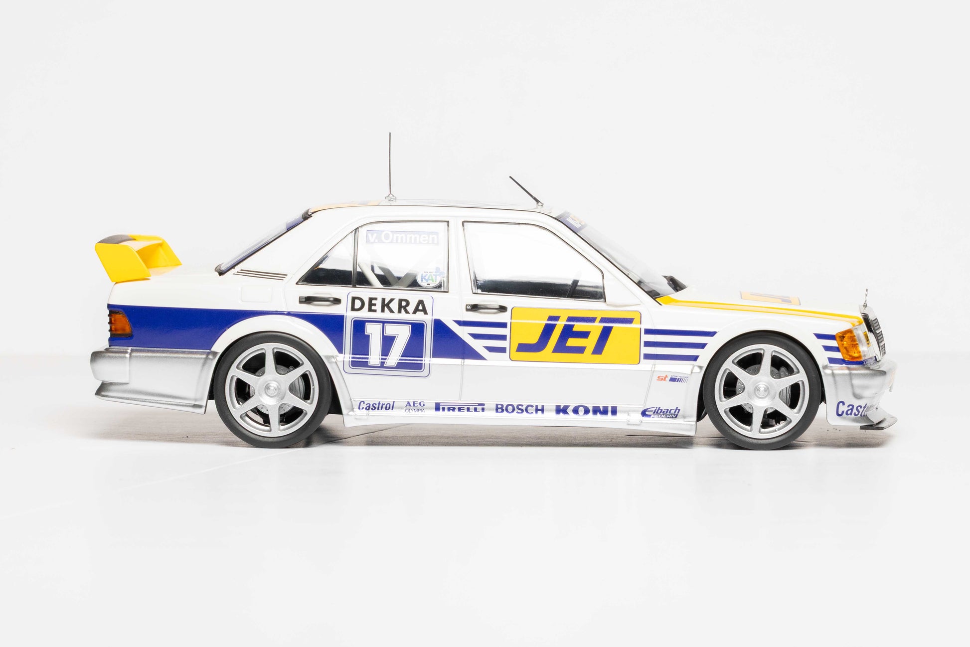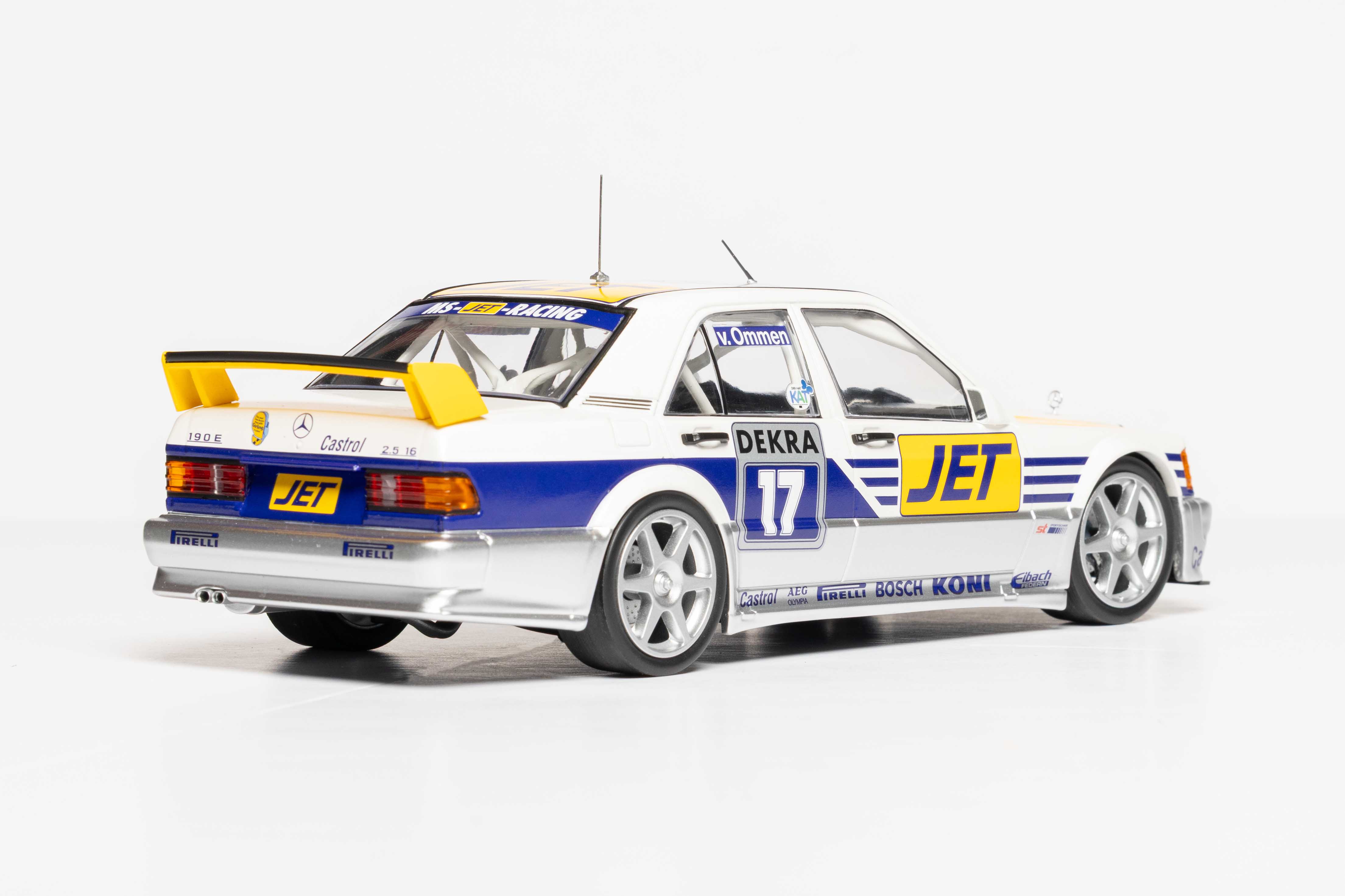 the #17 Mercedes-Benz 190E 2.5-16 EVO 1 driven by Jörg van Ommen for Team MS-JET-Racing during the 1990 DTM season. Featuring the distinctive JET livery, this high-detail, limited-edition (300 pieces) sealed diecast model captures the iconic early-90s touring car.