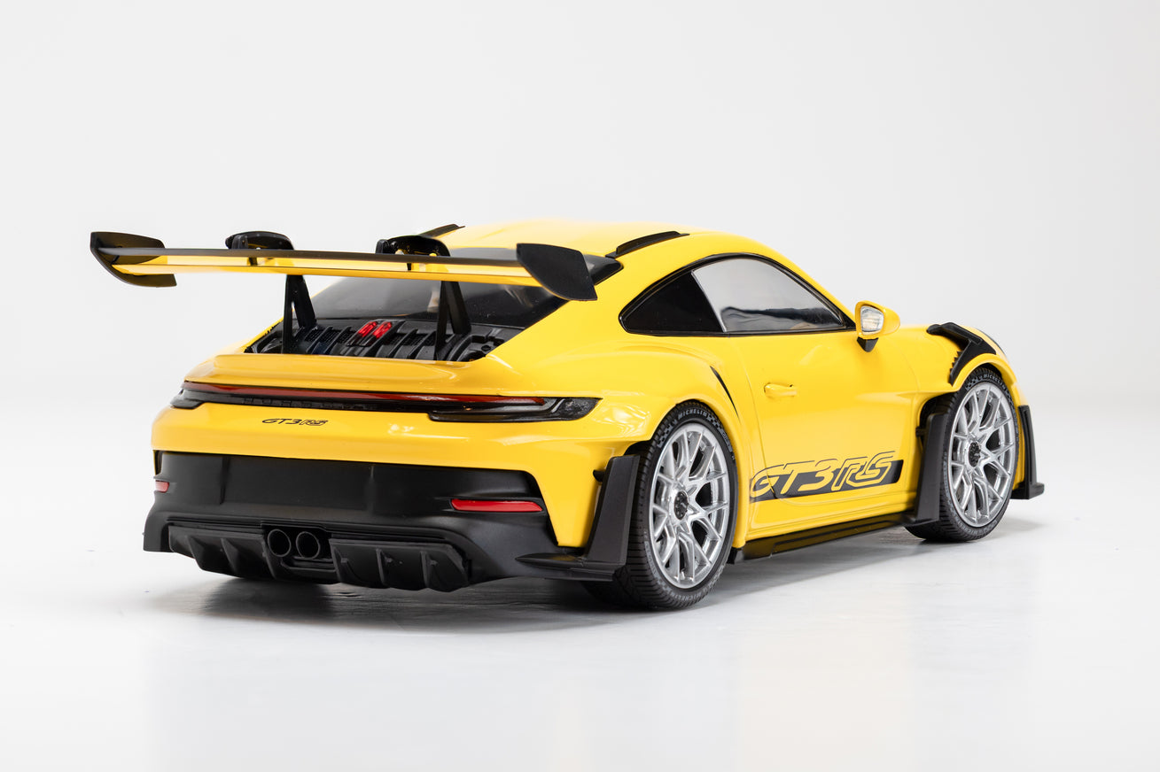 The Porsche 992 GT3 RS is a high-performance, track-focused sports car featuring a 4.0L naturally aspirated flat-six engine, radical aerodynamics with adjustable rear wing and active aerodynamics (PAA) with a Drag Reduction System (DRS), and extensive use of carbon fiber for lightweight construction