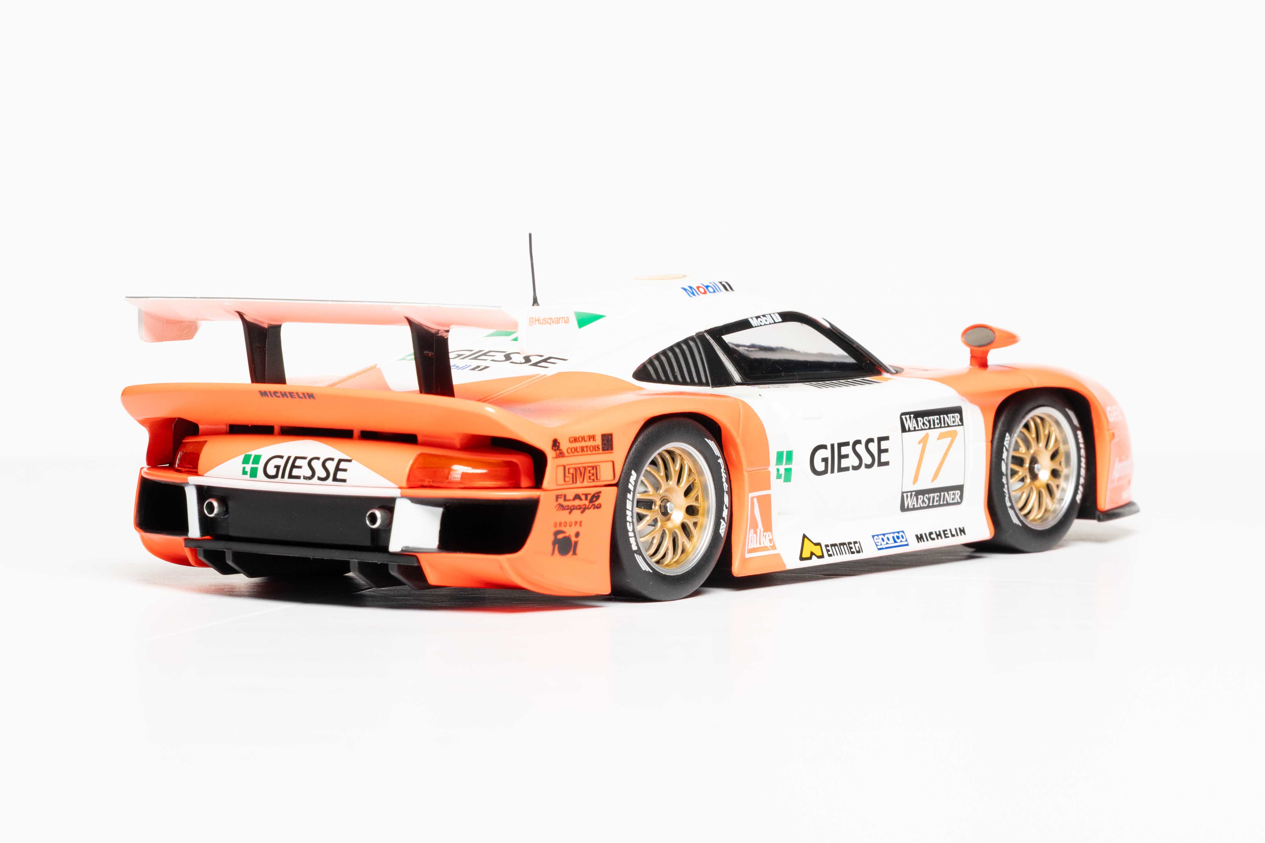 The 1997 Porsche 911 GT1 #17, driven by Emmanuel Collard and Mauro Baldi for JB Racing in the inaugural FIA GT Championship, is a legendary GT1-class endurance racer. It featured a 3.2-liter twin-turbo flat-six engine producing over 600 hp, with a distinct red-and-white livery often associated with Marlboro sponsorship.