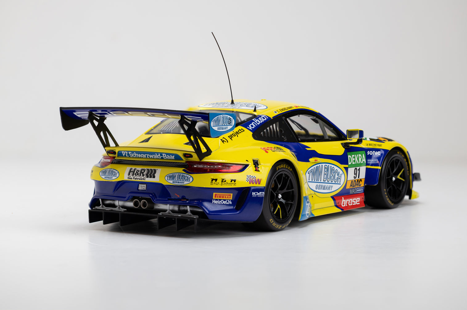 The Porsche 911 GT3 R #91 from the 2022 ADAC GT Masters season was driven by the team Joos Sportwagentechnik for drivers Christian Engelhart and Ayhancan Güven. The car was painted in a distinctive bright yellow and blue livery, and while the car is often associated with the team's nickname "Twin Busch" due to prominent branding, it finished the season as vice-champions. The start number 91 was chosen by the team principal because it is the year of his birth.
