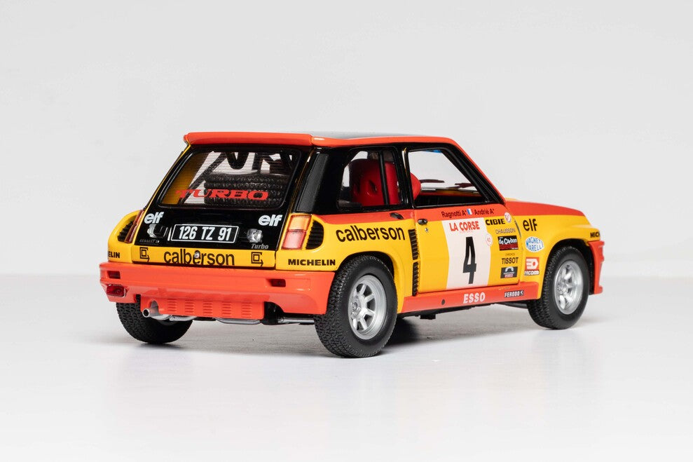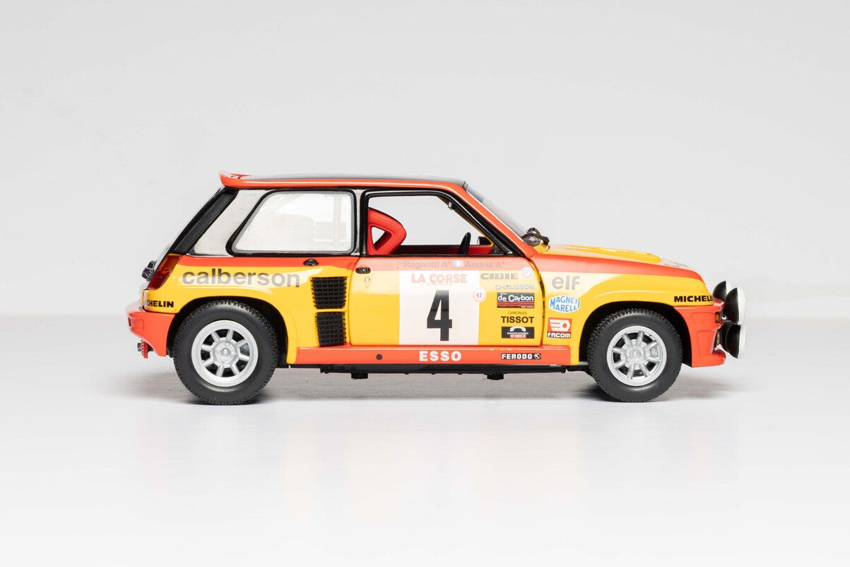 The Renault 5 Turbo "Calberson" was a factory-built Group 4 rally car, most notably the very first R5 Turbo to be homologated for international competition. Known for its striking yellow and black livery with sponsor branding from the French transport company Calberson, it holds significant historical value as a genuine piece of Renault Sport history.
