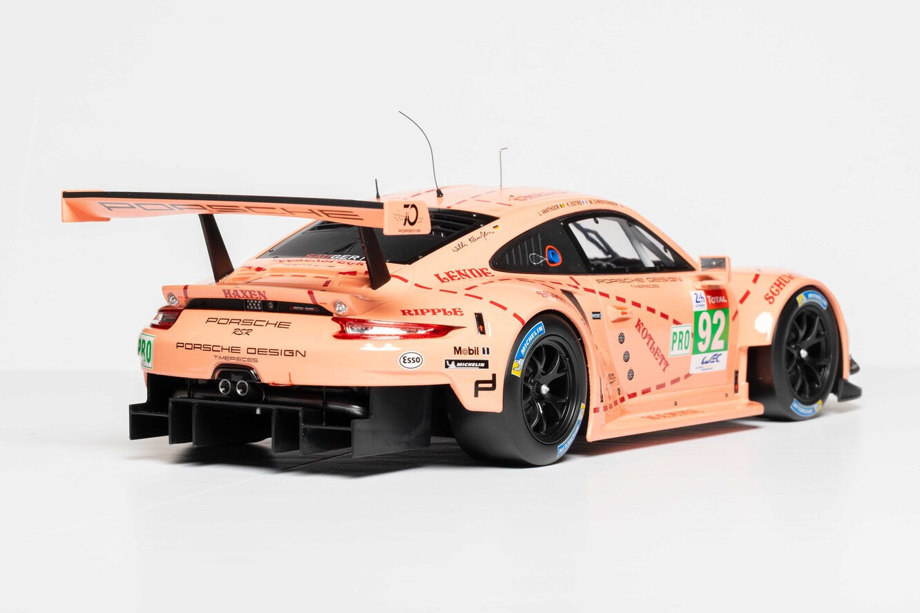 The Porsche 911 RSR "Pink Pig" livery is a, iconic, humorous design reviving the 1971 Porsche 917/20, featuring a matte pink base with red dotted lines mapping out butcher-style meat cuts (e.g., "haute," "épaule" for shoulder). Used in the 2018 24 Hours of Le Mans, this tribute car (No. 92) won its class.