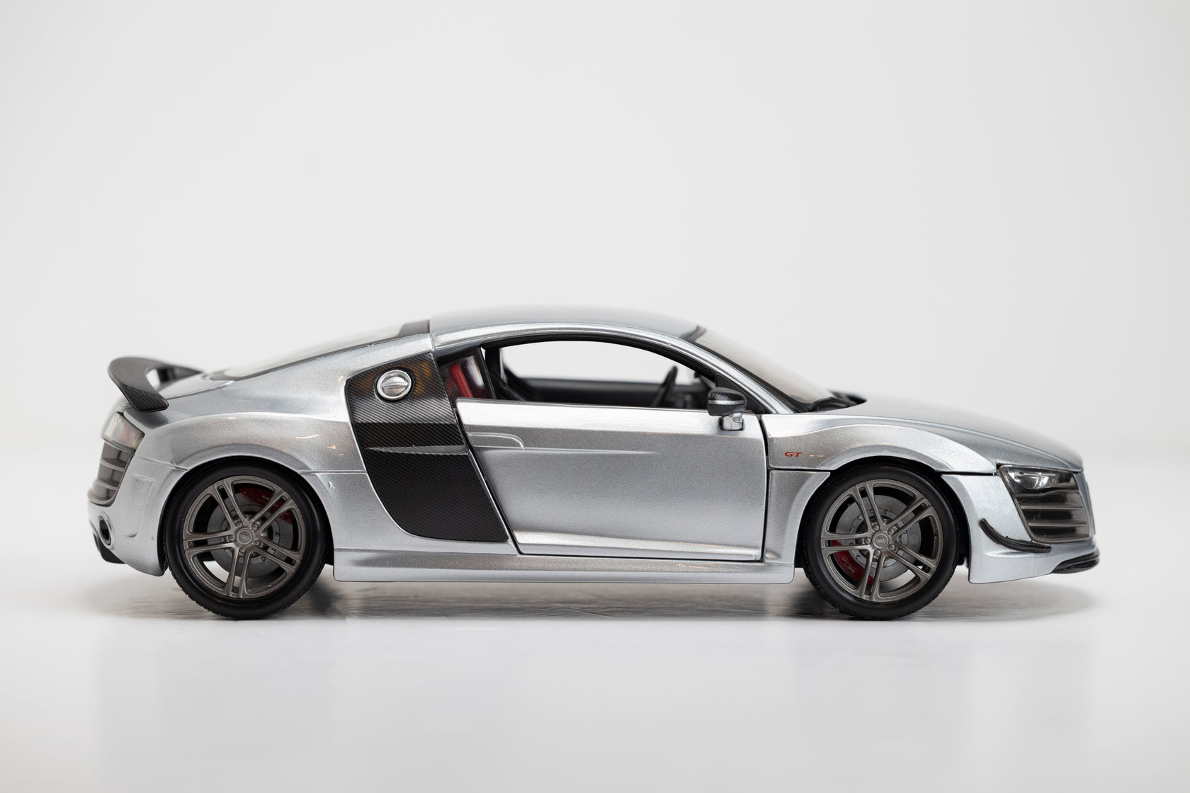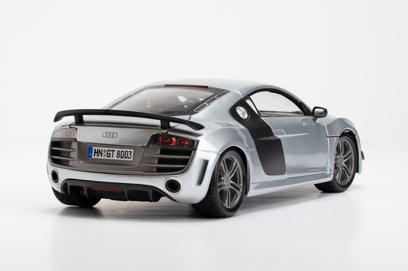 The Audi R8 GT model scale in grey highlights its aggressive styling and lightweight performance design, making it a prized collectible.