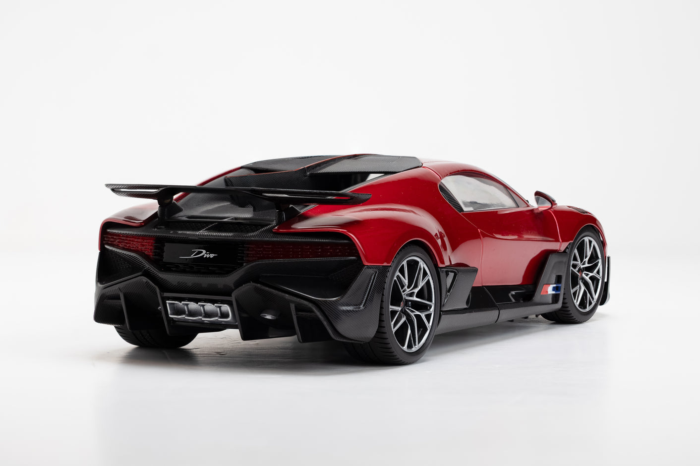 The Bugatti Divo model scale in red showcases its aggressive aerodynamic design and exclusive supercar styling, making it a premium collectible.