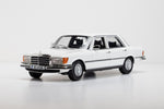 The Mercedes 450 SEL model scale in white showcases its classic luxury sedan design and elegant styling, making it a distinguished collectible.