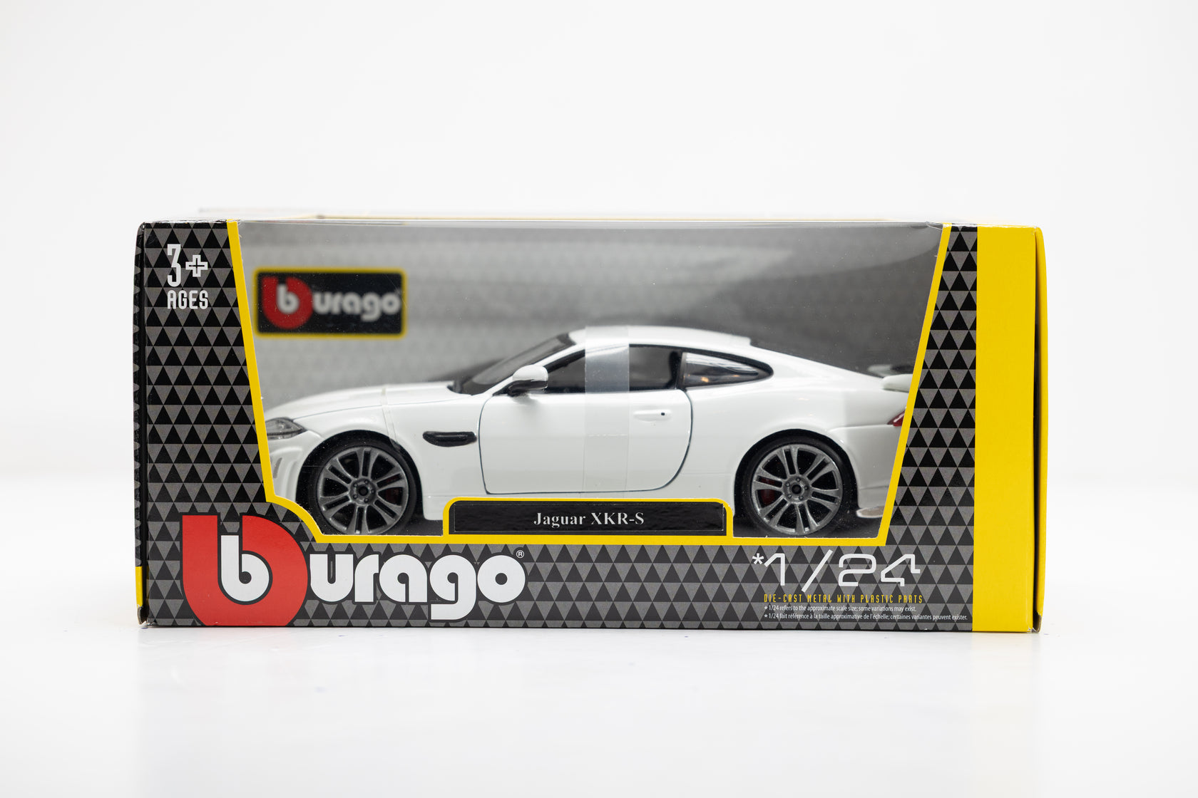 Jaguar XKR-S scale model in white, featuring sleek high-performance design and detailed craftsmanship, perfect for collectors and car enthusiasts.