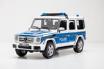 The Mercedes-Benz G-Class Polizei model scale in white and blue features authentic police detailing with the iconic G-Class design, making it a standout collectible.