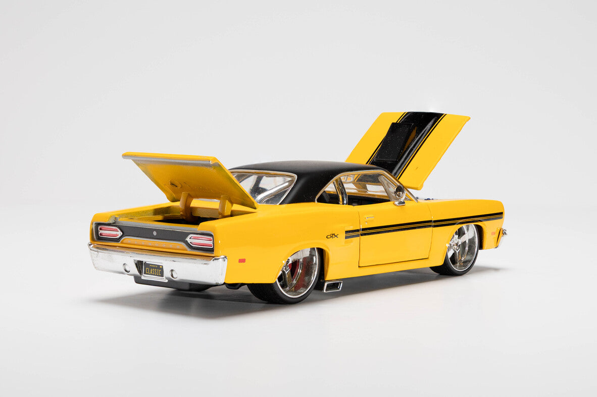 The 1970 Plymouth GTX is an upscale American muscle car known as a "gentleman's muscle car," combining aggressive styling and powerful V8 engines with a more refined interior and features than its sportier counterparts. It was equipped with a standard 440ci "Super Commando" V8, with performance-oriented options including the 440+6 "Six Barrel" and the legendary 426 Hemi. The 1970 model received styling updates, including a new grille, smoother body lines, a "power bulge" hood with a single scoop for the optional Air Grabber system, and non-functional rear brake scoops
