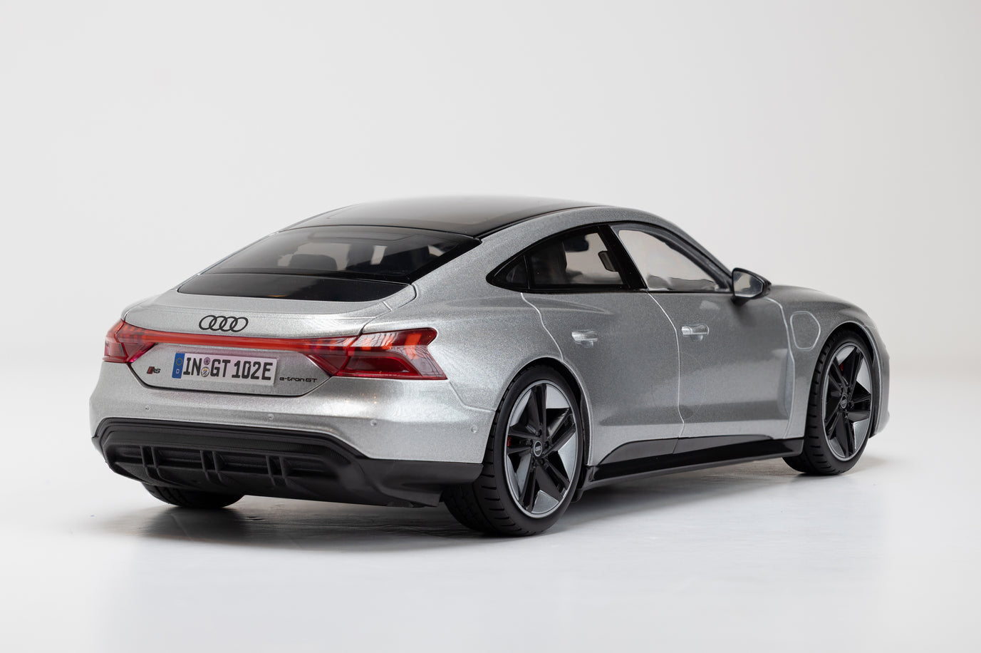 Audi RS e-tron scale model in grey, featuring sleek modern design and detailed craftsmanship, perfect for collectors and car enthusiasts.