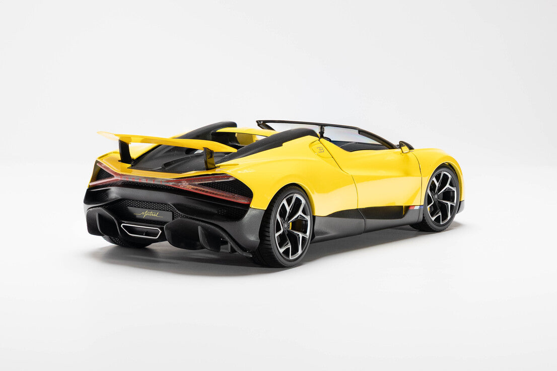 Bugatti Mistral scale model in yellow, featuring sleek high-performance design and detailed craftsmanship, perfect for collectors and car enthusiasts.