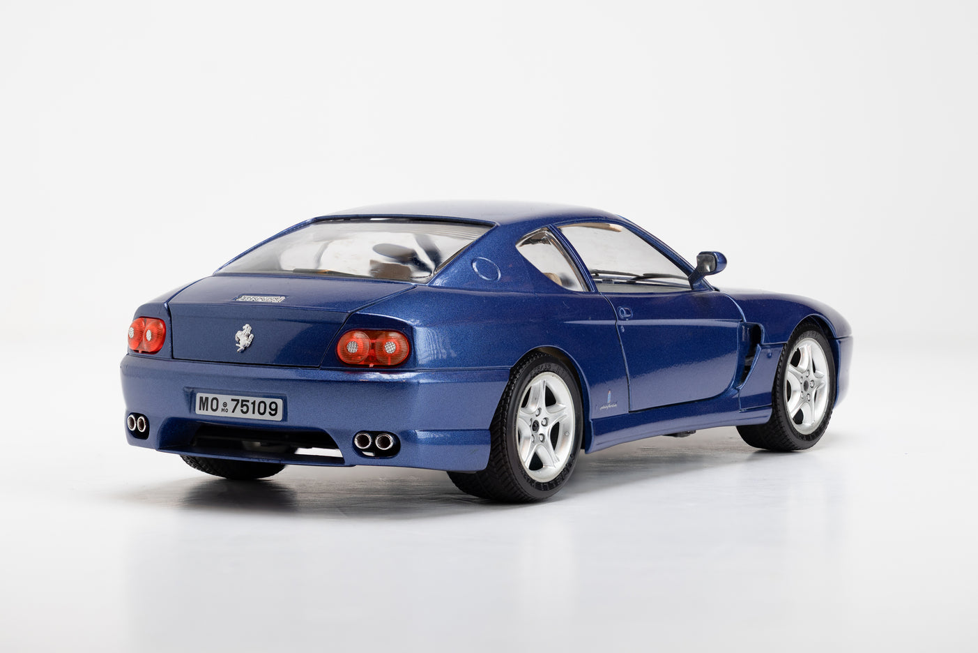 The Ferrari 456 GT, introduced in 1992, is a luxurious front-engine, rear-wheel-drive grand tourer featuring a 5.5-liter V12 engine, a classic six-speed manual transmission, and a flowing Pininfarina-designed body with retro styling cues