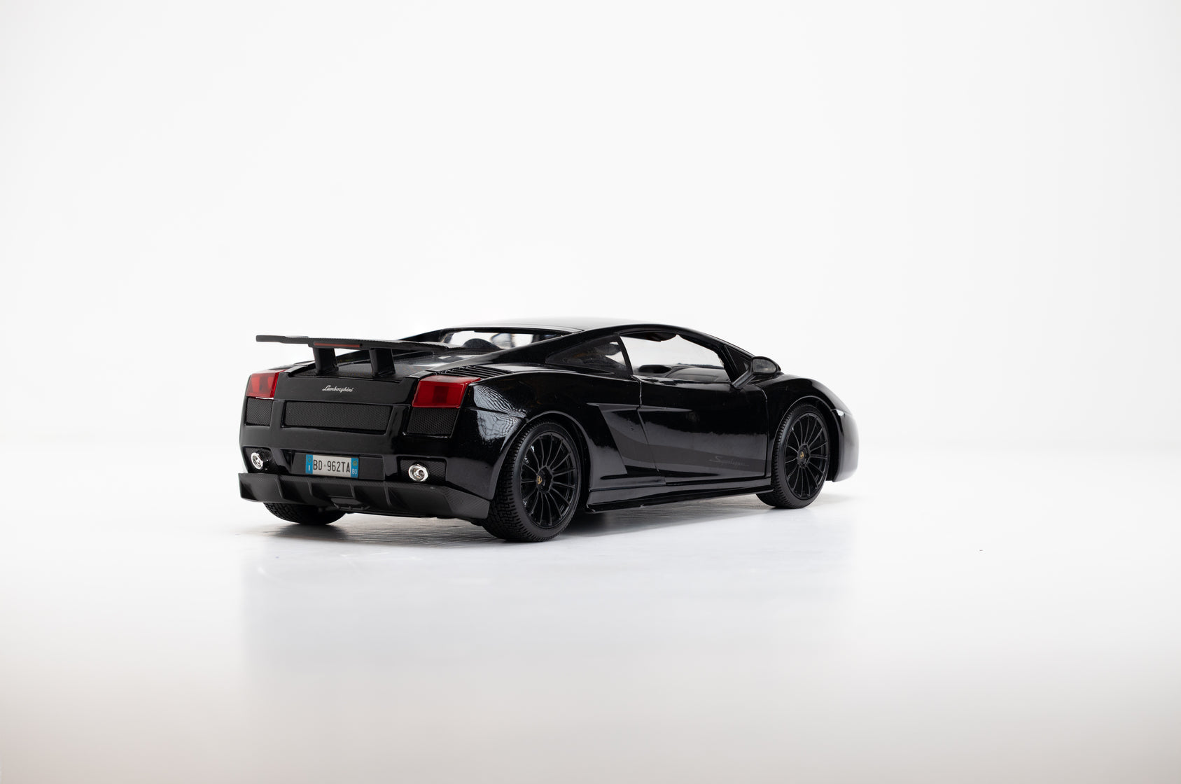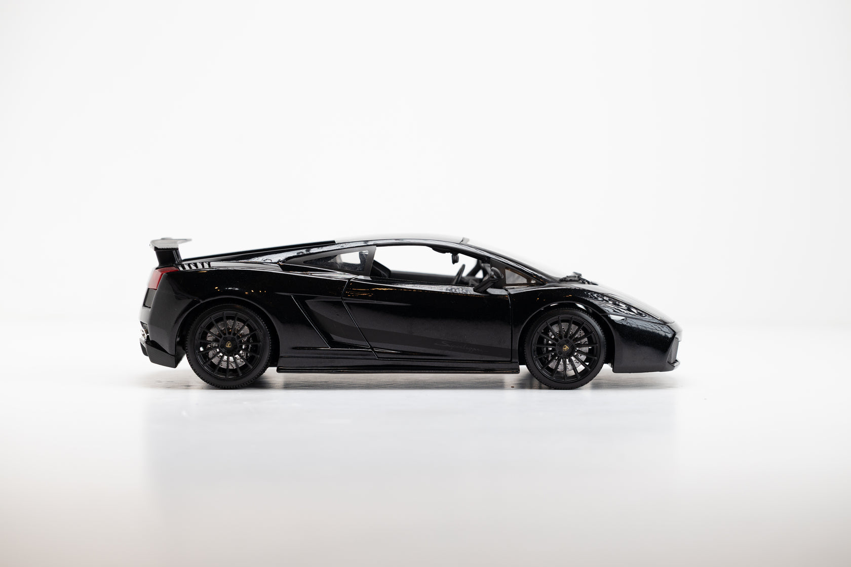 The Lamborghini Gallardo Superleggera model scale in black showcases its lightweight, aggressive design and sharp Italian styling, making it a prized collectible.