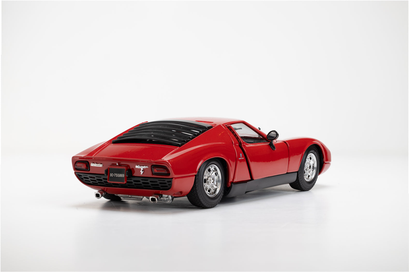 The Lamborghini Miura 1973 model scale in red showcases its iconic mid-engine design and classic Italian styling, making it a standout collectible.