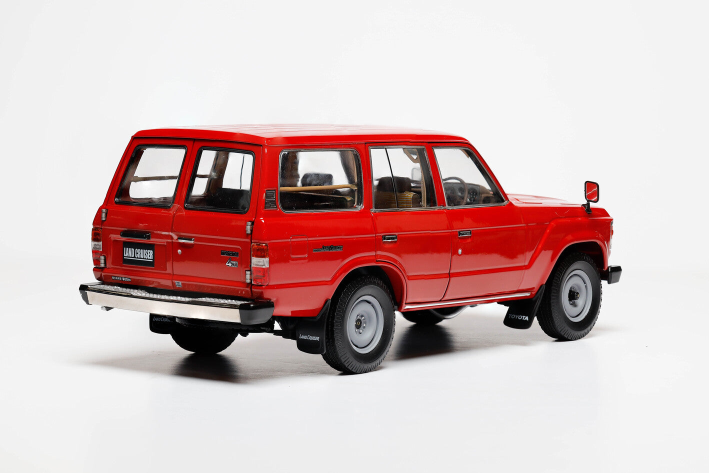 Land Cruiser 4WD 60 Series model in red, featuring a meticulously detailed resin body, authentic exterior styling, realistic interior with intricate dashboard and seats, durable tires, hand-finished, collector’s edition.
