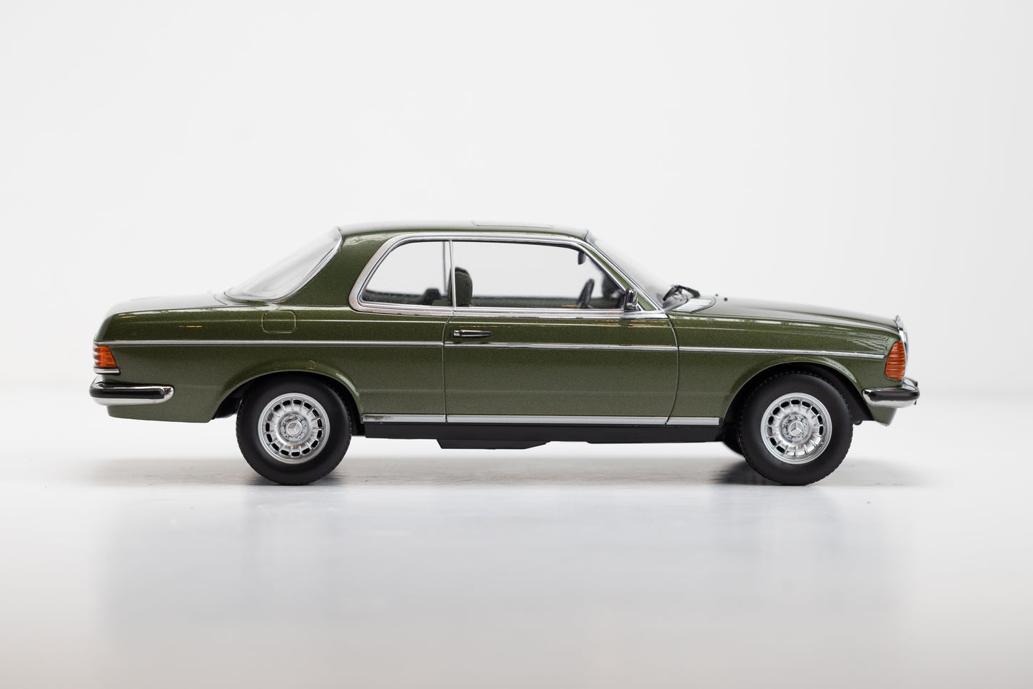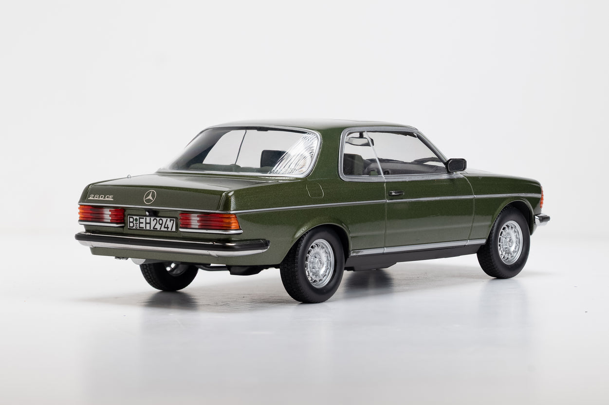 The Mercedes-Benz 280 CE model scale in dark green showcases its classic coupe design and elegant styling, making it a refined collectible.