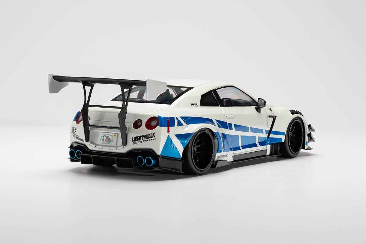 The Nissan GT-R (R35) Liberty Walk (LBWK) body kit transforms the car's aggressive look with an extreme widebody, race-inspired aerodynamics, and signature JDM styling, adding significant width and visual presence. Available in high-quality FRP (fiber-reinforced plastic) or CFRP (carbon fiber reinforced plastic), the kit includes components like large vents and scoops for improved ventilation, all designed for perfect fitment and a bold aesthetic.