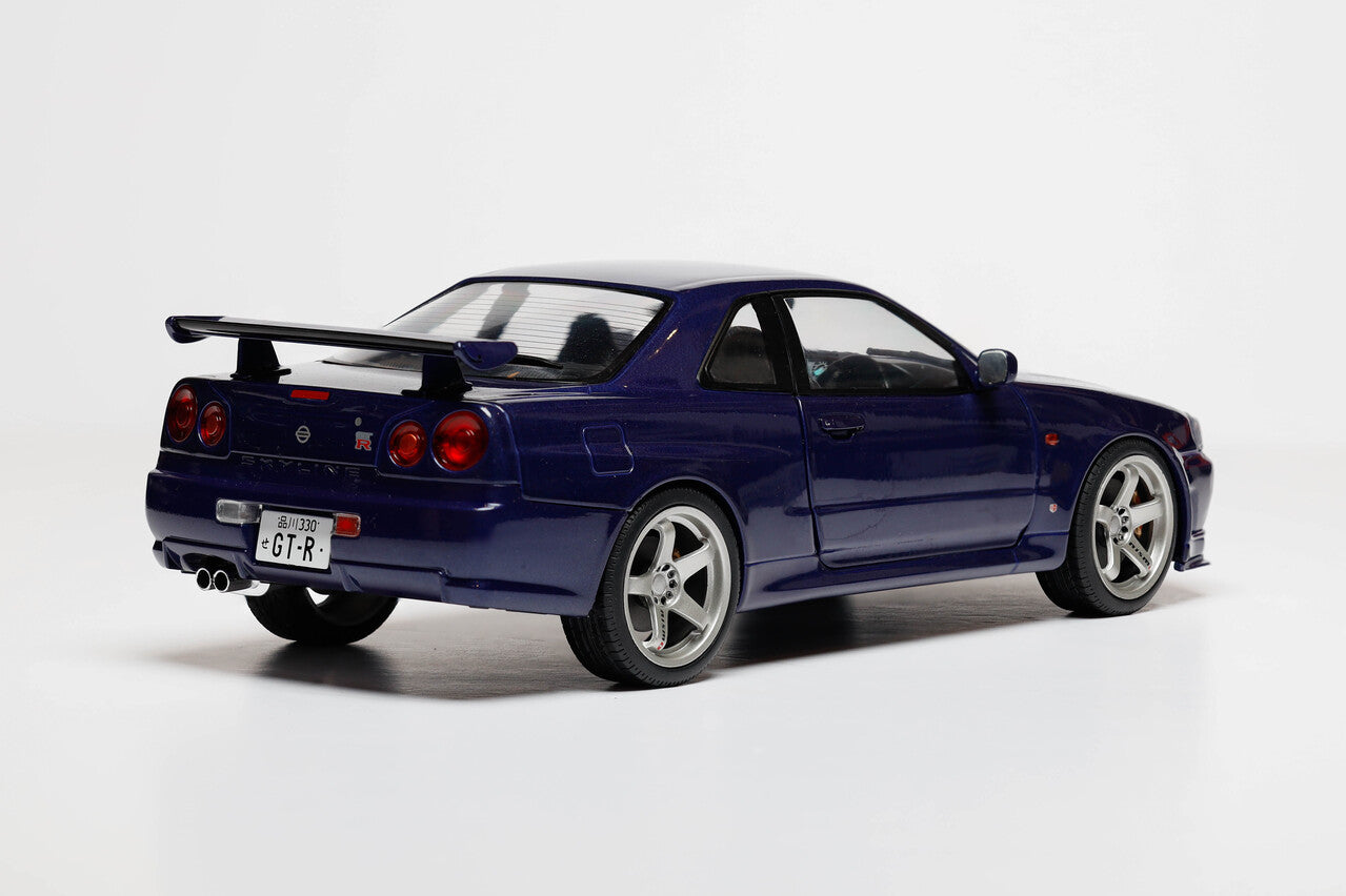 The iconic Nissan Skyline R34, produced from 1999 to 2002, is a highly revered Japanese sports car known for its refined, compact design and high-performance RB26DETT twin-turbo engine