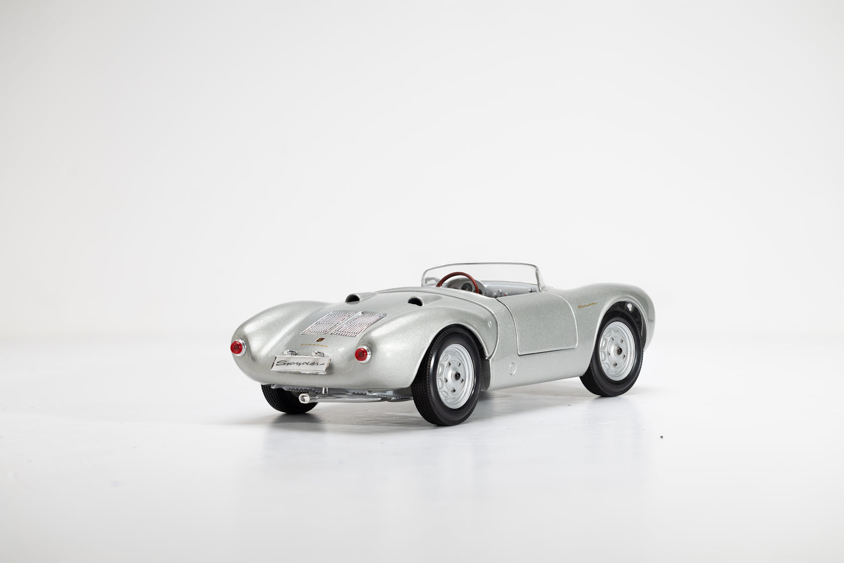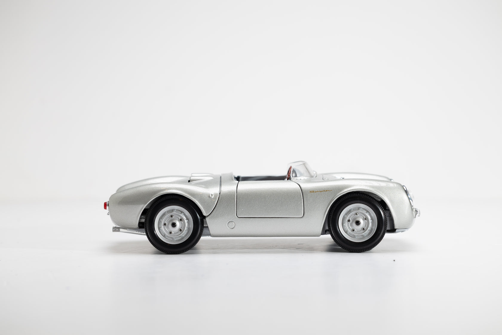 The Porsche 550A Spyder is a lightweight, mid-engine, rear-wheel-drive sports car produced from late 1956, featuring a tubular spaceframe chassis, a low-pivot rear suspension for improved handling, and a powerful 1.5-liter flat-four engine with dual overhead camshafts producing around 135 hp.