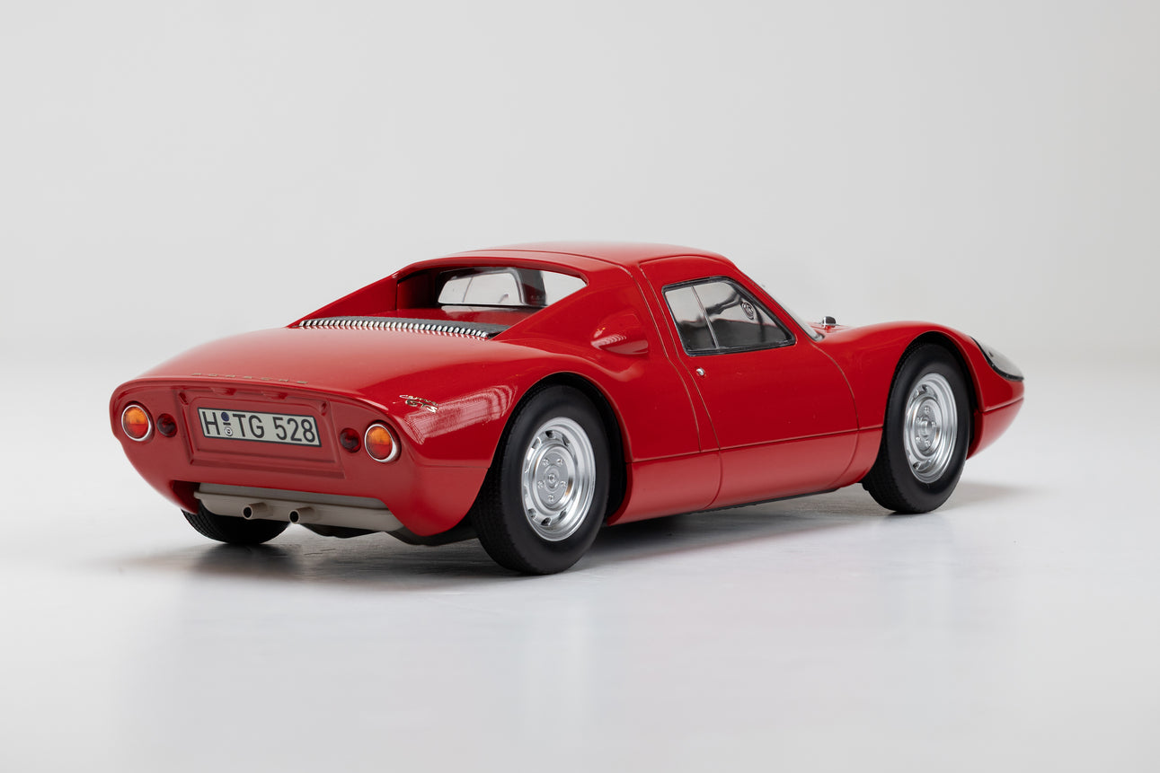 The Porsche 904 model scale in red showcases its classic 1960s racing design and sleek aerodynamic lines, making it a prized collectible for enthusiasts.