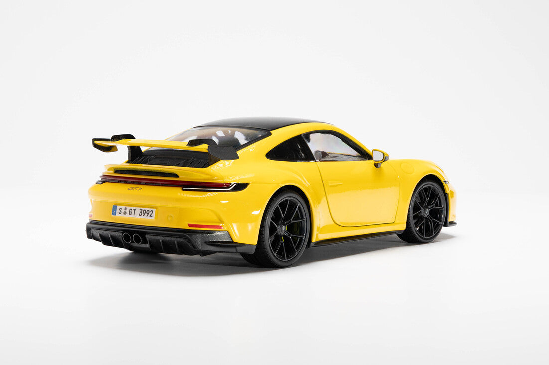 The Porsche 911 GT3 is a high-performance, naturally aspirated 911 sports car that emphasizes motorsport-derived engineering, featuring a high-revving flat-six engine, precise handling via an innovative control-arm front suspension, and a choice of a 6-speed manual or 7-speed PDK transmission. It uses lightweight materials such as carbon-fibre reinforced plastic (CFRP) for components like the bonnet and roof to enhance its already remarkable performance.