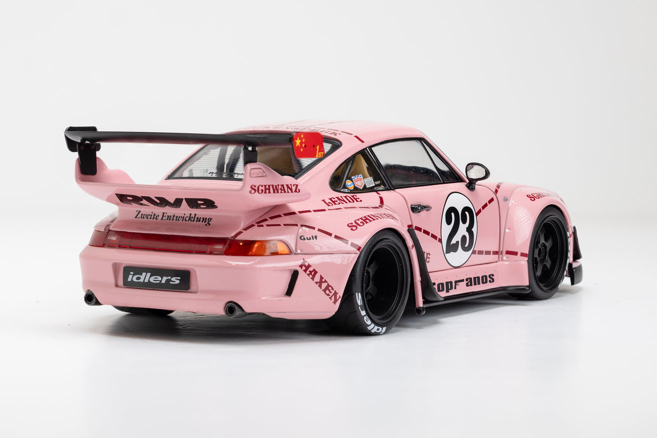 The Porsche RWB Pink Pig 2020 model scale in pink with number 23 showcases its widebody design and unique “Pink Pig” livery, making it a bold and collectible piece for enthusiasts.