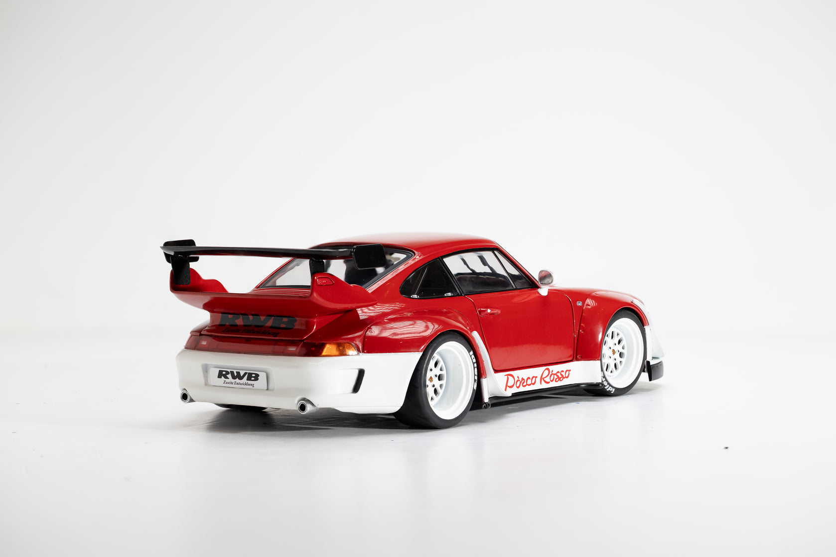 Porsche RWB Porco Rosso scale model in red and white, featuring wide-body custom design and detailed craftsmanship, ideal for collectors and car enthusiasts.