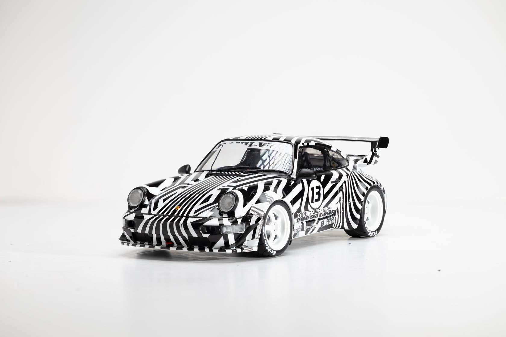 The PORSCHE RWB ZEBRA refers to a Porsche 911 (964 model) modified by Rauh-Welt Begriff (RWB), a Japanese tuning company, with a distinctive black and white "Zebra" camouflage livery applied to its widebody kit.