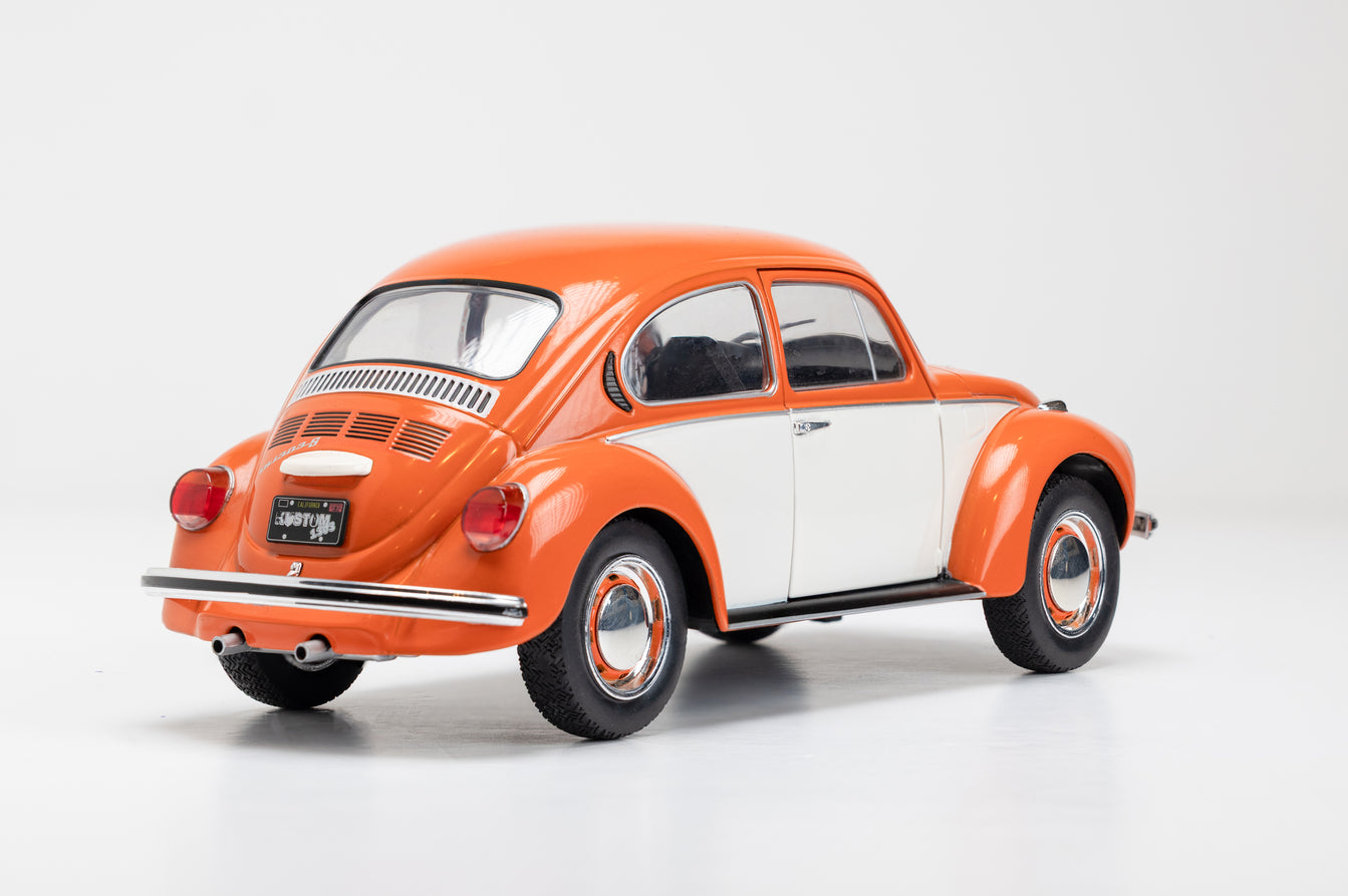 The VW 1303 Super Beetle model scale in orange highlights its classic rounded design and vintage charm, making it a vibrant collectible.